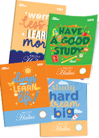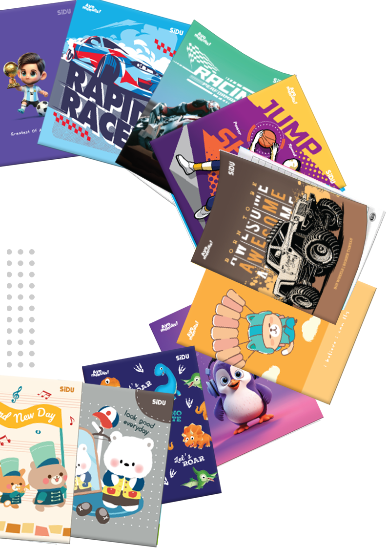 Buku tulis SiDU tersedia dalam berbagai sampul menarik, kertas putih bersih yang nyaman ditulis guna membantu siswa dalam proses belajar.
